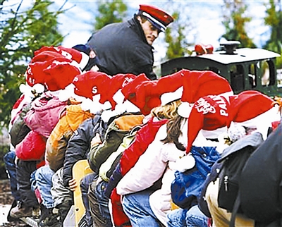 12月12日,在德国斯图加特市的圣诞礼品市场里,一些带着圣诞老人帽子的儿童在乘坐小火车围着市场转圈。肖劼 供图