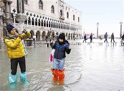 威尼斯本月遭受20年未见的大洪水侵袭,全城98%陆地被淹没。为挽救旅游市场,威尼斯旅馆业推出“威尼斯高水位”旅游促销计划,图为两名日本游客站在圣马可广场的积水中拍照留念。谢涛 供图