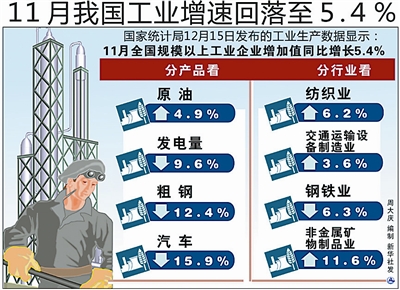 国家统计局15日发布的最新数据显示,11月我国规模以上工业企业实现增加值同比增长5.4%,增速比上月和上年同期分别回落2.8个和11.9个百分点。而10月增速比上月和上年同期分别回落了3.2个和9.7个百分点。