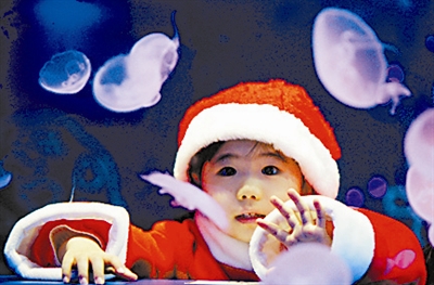 12月15日,在日本东京的一个水族馆,一名身着圣诞老人服装的女孩观看水母。圣诞节临近,这个水族馆为游客提供圣诞老人服装,供人们在馆内拍照留念,留下喜庆的回忆。