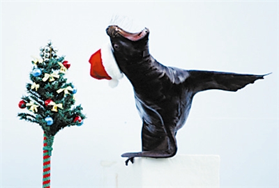 12月15日,在日本东京一家水族馆,一头海狮戴着圣诞老人的帽子,在一棵圣诞树旁“载歌载舞”。