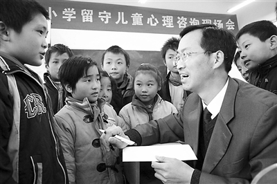 12月5日,安徽省含山县陶厂镇关镇小学,心理咨询师戴祥春正在为留守儿童进行心理咨询。当日,该小学开展以“快乐留守、铸造坚强”为主题的心理健康教育活动,通过互动游戏、亲情视频等方式帮助留守孩子缓解心理压力,健康成长。程千俊 摄