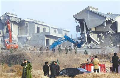 12月17日上午,备受社会关注的河南洛阳龙门石窟西山违法别墅群被当地政府强制拆除。近日,国内部分媒体公开报道了河南洛阳龙门石窟所在的龙门西山出现29栋违法别墅群,距离世界文化遗产地龙门石窟不到两公里。洛阳市委、市政府调查后认定,该别墅群属违法建筑物,依法予以强制拆除,并对洛阳市龙门管委会主管副主任程豪元等在内的9名官员进行问责。 张晓理 杨非 摄