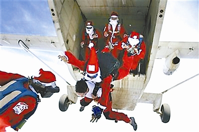 12月17日,在澳大利亚悉尼附近的皮克顿,数十名冒险爱好者参加了一项圣诞冒险活动。他们装扮成圣诞老人,进行了集体跳伞。图为他们从飞机上跳出的一霎那。谢涛 供图
