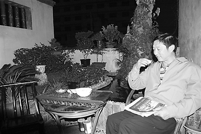 早晚时分,上“屋顶花园”读报、喝茶是杨多林的最爱。实习生 杨景慧 摄