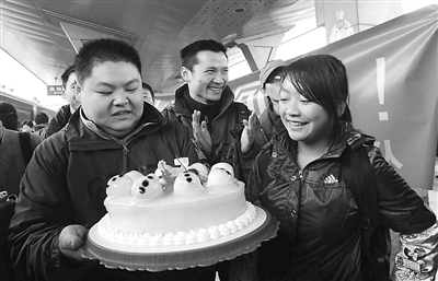12月18日,汶川漩口中学在异地读书的1000多名学生乘坐1097次列车顺利到达成都。上午出站口前就陆续聚集了众多来自地震灾区的家长,在接站的人群中有十来位特殊的年轻人,他们是曾经参加过“5·12”地震救援的四川山地救援队的队员,在这批返乡的学生中有个叫罗小凤的女孩是他们当时营救出来的,今天正好是小凤17岁的生日,队员特地准备了生日蛋糕,在站台上为小凤过了个简单而热烈的生日。 刘陈平 摄
