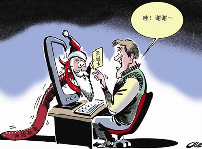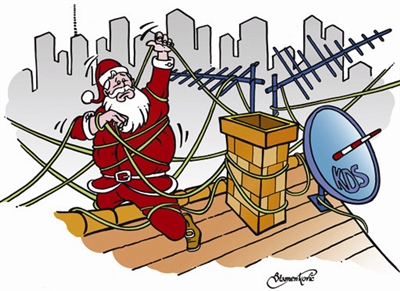 圣诞老人总是从人家的烟囱里送去圣诞礼物,可现在家家都装上了电视天线,这可为难了圣诞老人,一身电线难解难分了!