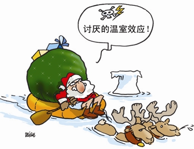 全球变暖,冰雪消融,圣诞雪橇可不是冲浪板,怎么应付得了茫茫海水呢?