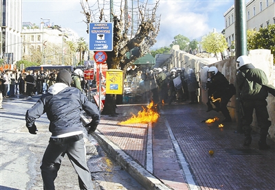 12月18日,一名希腊示威者在雅典向警察投掷燃烧瓶。希腊示威者当日在雅典举行了两场游行,在其中一场游行中,示威者与警察发生了冲突。6日晚,一名15岁少年在雅典与警察的冲突中被打死,随后在希腊引发大规模的抗议示威活动,目前抗议活动仍未完全平息。 新华社发(杨少波 摄)