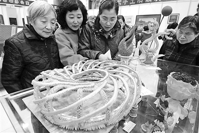 12月18日,市民参观“阳光工艺大舞台”工艺美术作品展。当日,杭州市第二届“阳光工艺大舞台”工艺美术作品展在杭州市工人文化宫开展。展览展出的雕刻、刺绣、布(纸)艺等200余件手工艺美术作品全部出自困难家庭、残疾人、下岗失业人员之手。新华社发(朱引炜摄)