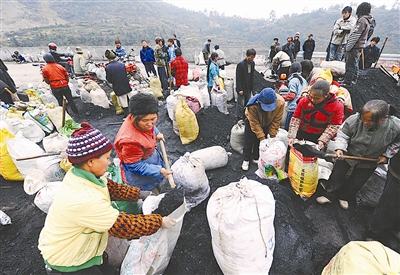 12月23日,贵州省贵阳市花溪区黔陶乡半坡村群众在领取政府免费送来的煤炭。气温骤降,黔陶乡根据居住在高寒山区半坡村59户低保户经济困难的情况,投入资金向低保家庭送去48吨煤炭,让每一个家庭都有一个温暖的冬天。吴东俊 摄