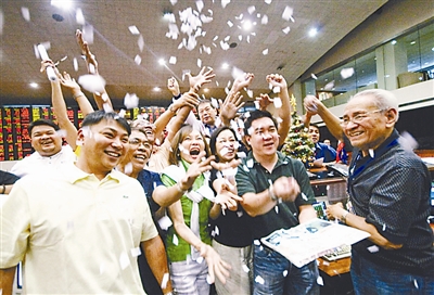 12月24日,交易员在菲律宾首都马尼拉的证券交易所,庆祝2008年最后一个交易日结束。新华社发(路易斯·里瓦纳各 摄)