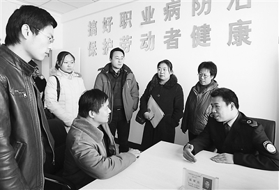 12月25日,石家庄市长安区部分企业工会的负责人和职工代表,在向职业健康与卫生指导服务中心的工作人员咨询有关防治职业病和劳动安全卫生方面的问题。当日,河北省首家乡镇工会职业健康与卫生指导服务中心在长安区高营镇成立。该中心由长安区工会、高营镇党委、政府和卫生监督所共同协商成立,将在指导和督促用人单位为劳动者提供符合国家职业卫生标准和卫生要求的工作环境和条件,维护劳动者职业健康与安全方面发挥作用。本报记者 张世斌 摄