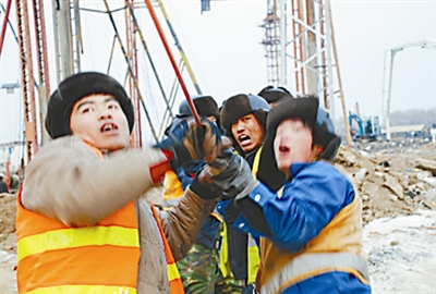 由中铁电气化局工程总承包修建的新建北京动车段工程,东起北京南站,途经广安门、白盆窑,西至新建北京动车段检修基地,全长15.3公里。图为施工人员在现场进行人工接触网放线作业。 曹颖 李忠民 摄
