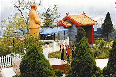 11月9日13时29分,平煤二矿矸石山顶绿化园内,几位学生向毛主席的雕像致敬。这个矸石山曾经严重污染城市,是全国第一个对矸石山实施绿化改造的工程。于文国 摄