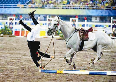 8月21日18时42分,奥运会男子五项比赛中的马术赛场,中国运动员曹忠荣不慎失足坠马,“表演”了一个漂亮的下马动作。 于文国 摄
