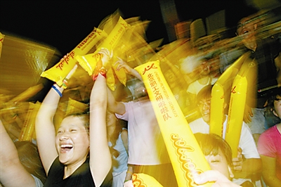 8月13日20时51分,由职工代表组成奥运职工拉拉队在为奥运健儿加油。 杨登峰 摄