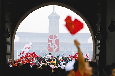 8月6日9时16分,奥运会火炬开始在北京传递,第一站从故宫午门传递,担任第9棒火炬手的姚明从天安门城楼下穿过。 杨登峰 摄
