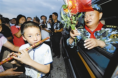 7月23日6时07分,首批抗震救援部队撤离灾区,一名震区的孩子用笛声《送别》表达感激。 于文国 摄