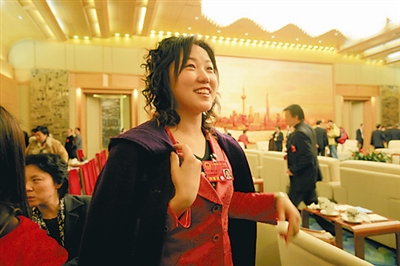 3月6日,在人民大会堂上海厅,新当选的农民工人大代表朱雪芹到会参加小组讨论。她是本届新当选的三位农民工代表之一。于文国 摄