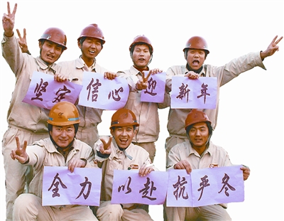 山东莱钢集团动力部水力车间检修班员工打着手势相互加油鼓劲。 卢燕华 摄