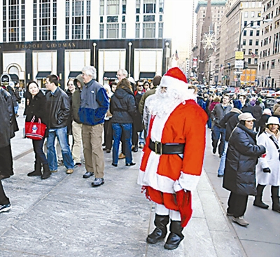 12月25日,在美国纽约街头,一名男子装扮成圣诞老人等待路人与其合影,每人收取1美元的费用。经济衰退令美国今年的圣诞消费季远不如往年景气。商家都在抓紧年底最后的节庆商机来大力促销。 新华社记者 侯俊 摄