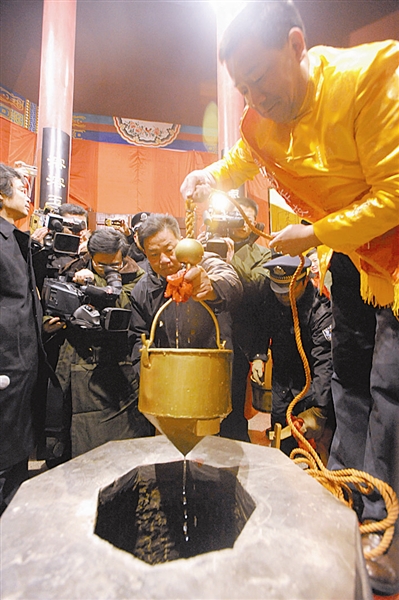 九朝贡胶是过去东阿县专门用来进贡朝廷的阿胶传统名贵品种,需要当地县官监督,在冬至这天子时取东阿阿胶井里的至阴之水,用乌头驴的驴皮和桑木柴等古方炼制,这项传统工艺已中断上百余年。图为东阿阿胶职工正在冬至子时取阿胶至阴之水。 吴延华 摄