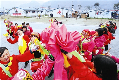 12月29日下午,经历了大地震灾难的北川县擂鼓镇的羌族村村民们在临时安置点上,正在盛装排练羌族腰鼓舞。两天后,她们将在全镇大集会上一展英姿。本报记者 于文国 摄