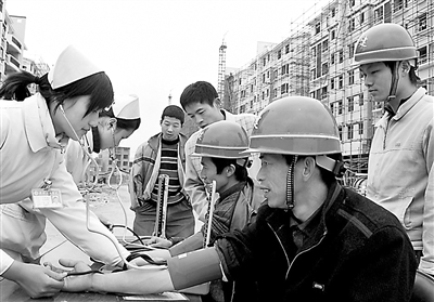 新年将至,江西省赣县人民医院组织医疗小分队深入工地,免费为农民工进行健康体检,并发放卫生防病健康处方,赠送御寒物品等,为即将返乡过年的农民工们带来冬日暖意。马晓敏 摄