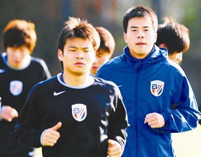 12月29日,上海申花队球员孙吉(右)与队友在训练前慢跑热身。近日,为备战2009年3月开始的亚冠联赛,上海申花足球队来到昆明红塔体育中心展开为期4周的高原集训。新华社记者 邹峥 摄