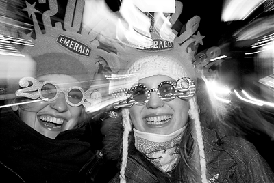 2009年1月1日,在美国纽约时报广场,两名德国游客庆祝新年的到来。2008年12月31日夜,逾百万民众冒着零下五六度的低温聚集在时报广场参加新年倒计时活动,欢庆2009年的到来。时报广场的迎新年活动始于1904年,是全球最隆重的新年庆典之一。新华社记者 侯俊 摄