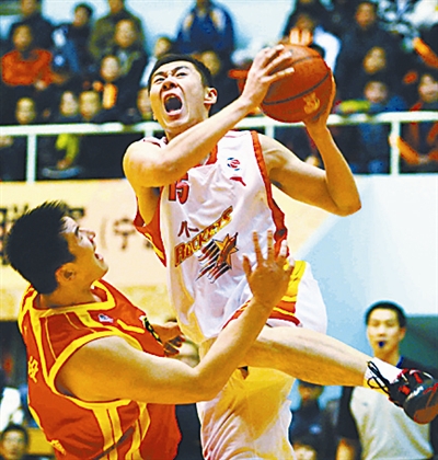 1月2日,在2008-2009赛季CBA联赛第21轮的比赛中,八一双鹿队主场以80比86不敌浙江广厦队。图为八一双鹿队球员吴谦(右)篮下进攻。 新华社发(王灿 摄)