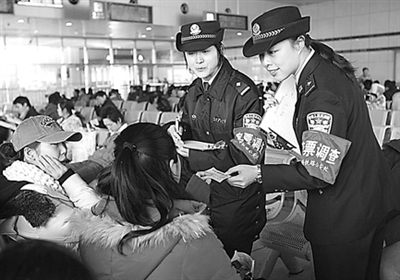 元旦前夕,上铁公安处组织机关干部深入站车一线,开展大规模的客票调查活动, 逐一向旅客进行问卷调查,通过车票来源分析,收集倒卖火车票的线索,顺藤摸瓜实施精确打击,为元旦和春运创造良好的治安环境,确保广大旅客平安出行。林荣贵 摄