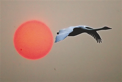 1月4日,山西平陆,一只白天鹅在黄河湿地上空飞翔。近日,随着湿地气温的不断回升,来山西平陆黄河湿地越冬的天鹅不断增加,数量达到近万只,是历年同期最多的一年。