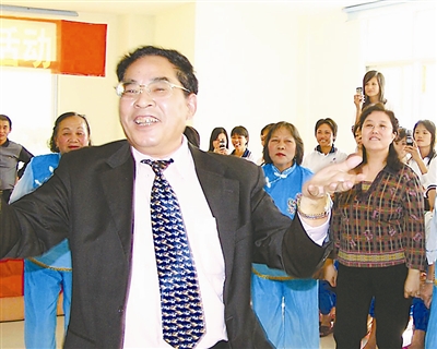 这是在一次全国县级工会主席培训班上,王乃武代表海南省参加联欢晚会表演儋州调声(一种当地歌舞)时的一个场景。