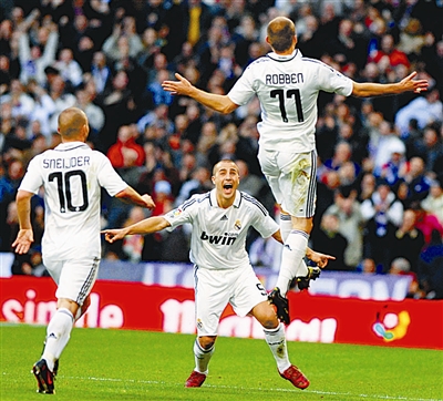 1月4日,在2008-2009赛季西甲联赛第17轮比赛中,皇家马德里队主场以1比0战胜比利亚雷亚尔队。图为皇家马德里队球员罗本(右一)与队友在比赛中庆祝进球。 新华社记者 陈海通 摄