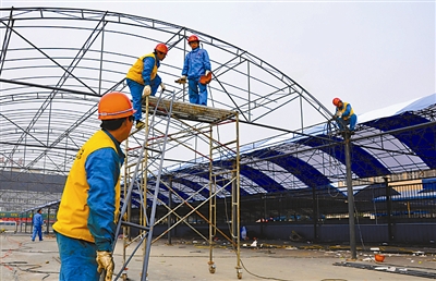 1月7日,四川绵阳火车站职工正在搭建春运临时候车棚。