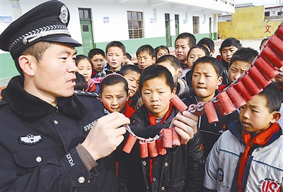 1月5日,山东枣庄市山亭区公安分局的民警为凫城乡中心小学的学生讲解燃放鞭炮的正确方法。当日,山东枣庄市山亭区凫城乡中心小学邀请当地的消防队员和公安干警为学生上安全教育课,强化学生的安全意识和提高学生的自防自救能力,确保他们快乐安全地过寒假。新华社 李宗宪 摄