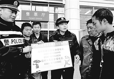 日前,福州铁路公安民警在福州火车站向旅客进行安全宣传。春运在即,福州铁路公安民警在严密防范和严厉打击各类犯罪活动的同时,提醒旅客保管好自己的行李,不要随意向路人购买火车票,提高自我保护意识,确保平安返乡。 新华社记者 张国俊摄