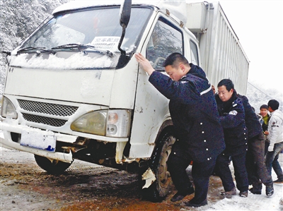 1月7日,印江交警与滞留在苗王坡上的乘客一起帮助一辆货车上坡。