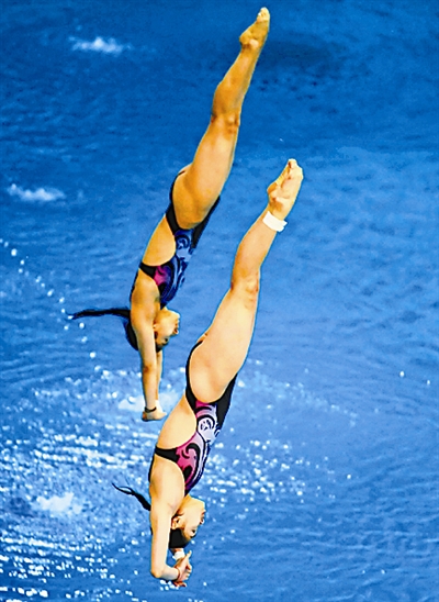 1月8日,国家跳水队及花样游泳队在香港举行慈善汇演,为将于2009年12月在香港举行的第五屆东亚运动会筹款。图为国家跳水队队员郭晶晶(左)和吴敏霞在汇演上表演。新华社记者 吕小炜 摄