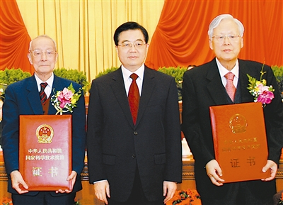 1月9日,2008年度国家科学技术奖励大会在北京人民大会堂隆重举行。中共中央总书记、国家主席、中央军委主席胡锦涛向获得2008年度国家最高科学技术奖的中国工程院院士王忠诚、中国科学院院士徐光宪颁奖。 新华社记者鞠鹏摄