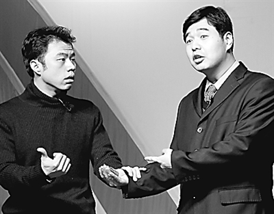 “练习时苦;演出时甜。”1月7日,武昌南机务段电力二组职工裴华开心地说着自己的新年演出。在刚刚落幕的武昌南机务段2009年迎新春文艺演出中,裴华(图右)和搭档吴泽龙等首次自编自创自演、针时贬弊的小品《三保公司》赢得了职工的阵阵喝彩。这让他信心十足,为自己创作的节目能登上铁路局的表演舞台而努力着。 汪东亚 摄