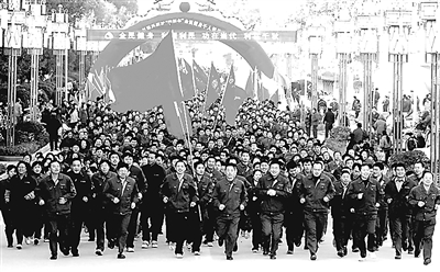 元月1日,迎着新年的第一缕阳光,江铜集团德兴铜矿1000多名员工以参加“迎新年全民健身千人健康跑”活动表达意愿:面对金融危机,全体员工要以健康的身体、不屈不挠的精神,昂首迈步2009年。 吴朝仁 摄