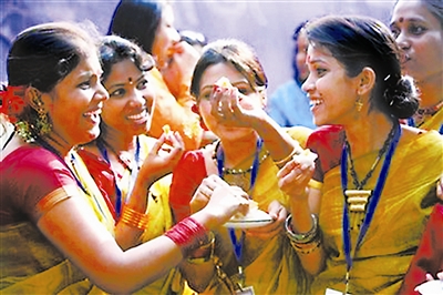 1月9日,孟加拉国在首都达卡举行的冬季博览会开幕。图为几名孟加拉妇女身着孟加拉传统服装在开幕庆祝酒会上。 吉平 供图