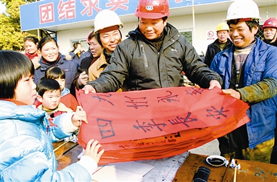 当日,安徽省巢湖市少年宫书法班的10多名小朋友来到巢湖市人民路一工地,为农民工免费写春联。新华社发