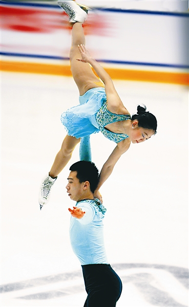 1月10日,第十一届全运会花样滑冰预赛在京结束。北京世纪星俱乐部的董慧博(上)/仵一鸣以145.09分夺得双人滑比赛金牌,拿到职业生涯首个全国冠军。 本报记者 许之丰 摄