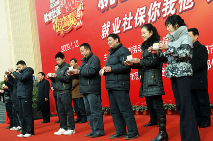 1月12日,在四川省科技馆南门广场,待就业群众代表领到就业券。当日,成都市正式向315名失业返乡农民工、2008届以前未就业大中专毕业生和因企业停产或者经济性裁员而新增的就业转失业等三类人员,发放了价值15.75万元的就业培训券。