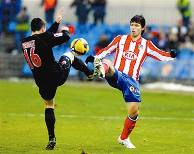 1月11日,在2008-2009赛季西班牙足球甲级联赛第18轮比赛中,马德里竞技队主场以2比3负于毕尔巴鄂竞技队。图为马德里竞技队球员阿圭罗(右)在比赛中争抢。