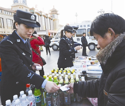 1月12日,北京站公安段警察在北京站广场向旅客和商户发放警民联系卡,方便旅客报警和监督工作。新华社记者 唐召明 摄